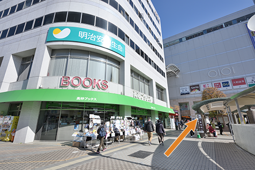 2緑の雨よけが目印の高砂ブックス様を通り抜けます。